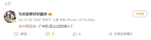 有内情?韦世豪质问中国足协:广州队怎么过的准入? ​​​