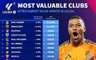 德转更新西甲球队总身价:皇马13.3亿欧居首,巴萨10.7亿欧第二