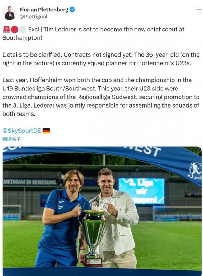 德天空:霍村U23阵容规划师莱德勒将出任南安普顿首席球探
